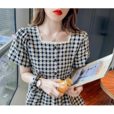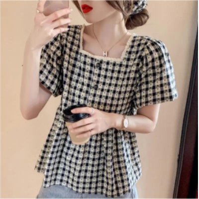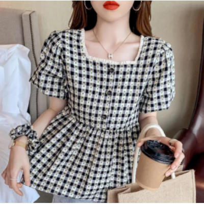 Home > Apparel > Miss > Puff Sleeve Ruffle Skirt Blouse Women Summer Chic Designer Plaid Puffy A Line Square Collar Kids Shirt (2pcs)